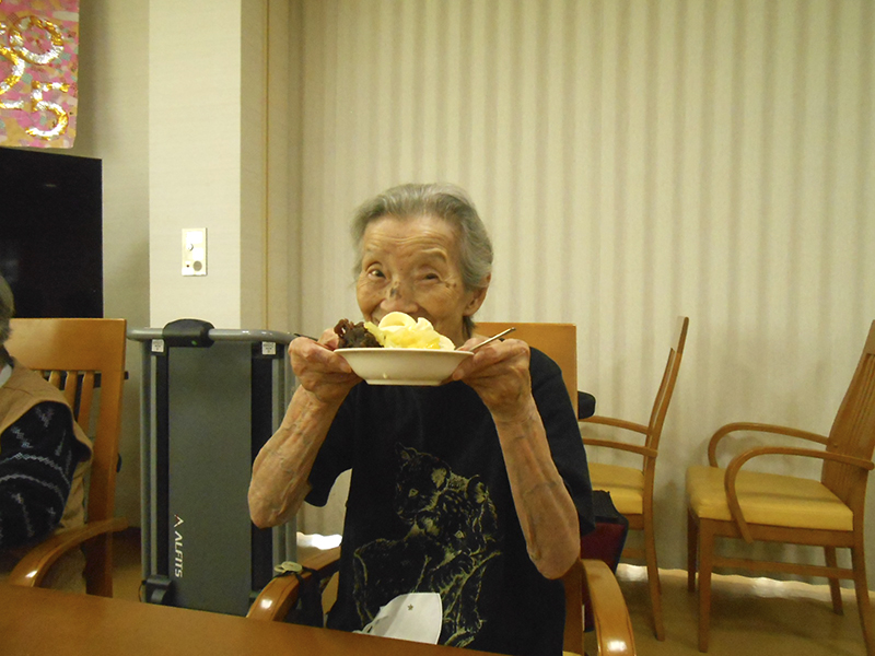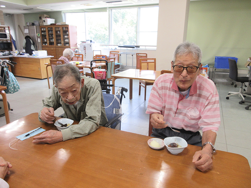 「あんこ多めがいいな」「アイスクリームおいしそう」と皆さん好きなものを好きなだけ取り分けています。欲張ってお皿いっぱいに全部をのせる方もありました。よそった方から順番に食べてもらいます。