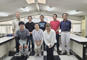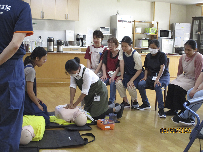 技能実習生や特定技能のスタッフは初めての体験です。人形を使って胸骨圧迫やAEDの基本的な使い方を学びました。慣れない日本語での声掛けにとまどいながらも一生懸命に取り組みました。
