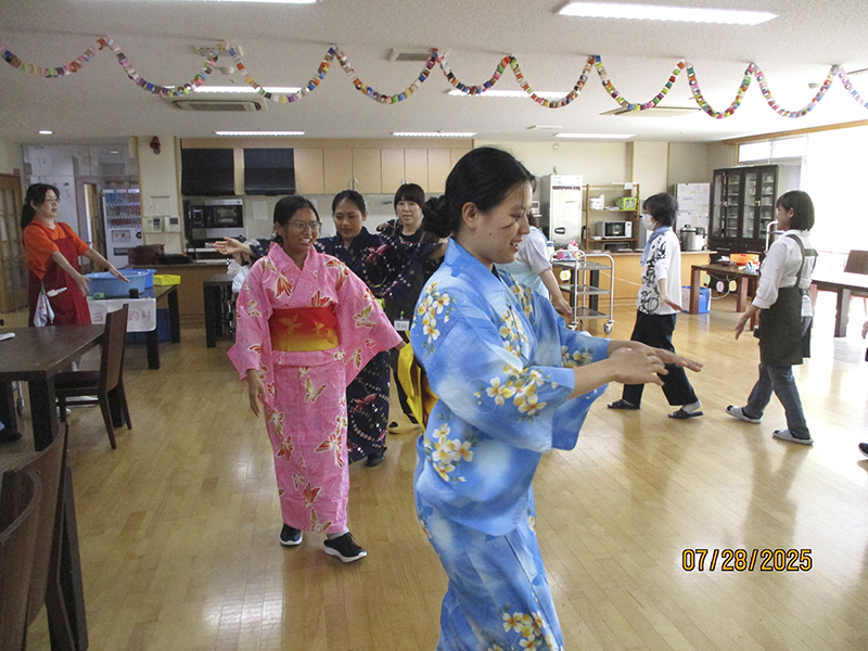 「みのり貝塚」では、厳しい暑さの中、7月28日に納涼祭を行いました。まず、ミャンマー出身の職員が浴衣に着替えて元気良く河内音頭を踊って盛り上げます。