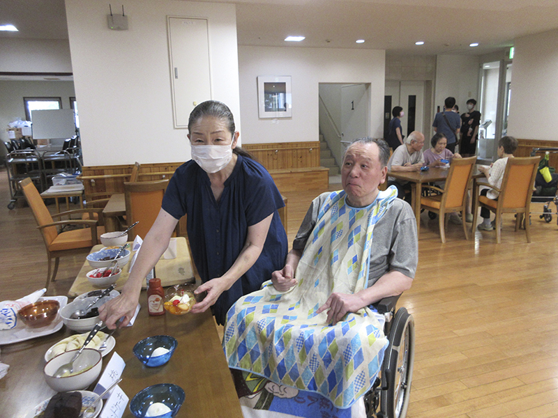 こんなさなかの「アイスパフェ作り」は大盛況! 参加者は21名。食堂は「喫茶みのり」に早変わりしました。アイスクリームをカップに入れて好みの具材をのせます。一口サイズにカットした10種類以上の材料を用意しました。「どれにしようかな」「全部入れて」「夢がかなった」と皆さんとても楽しんでおられます。