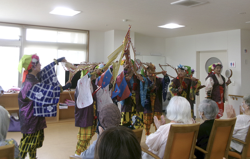続いて、皿回しとお待ちかねの南京玉すだれ。スカイツリーと東京タワー、通天閣が並んだ時には大きな拍手が起こりました。きらびやかな衣装といろいろな演目に入居者の笑顔も輝きます。